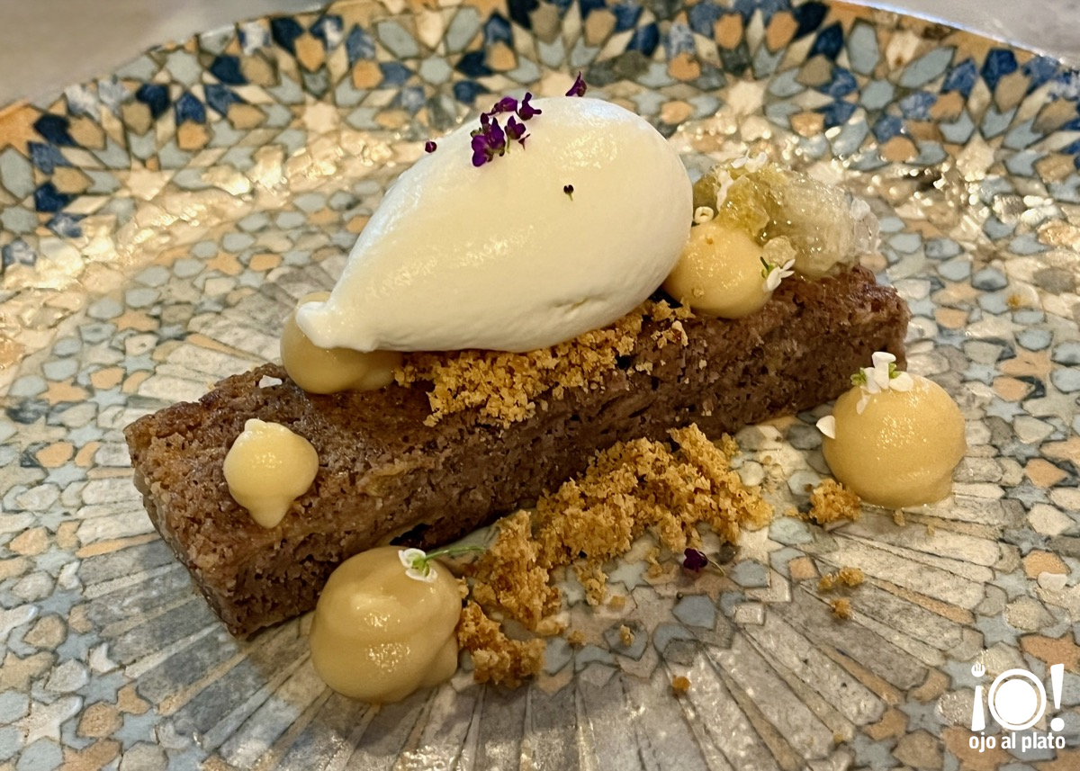 El último de los postres fue también exquisito. Bizcocho de manzana, helado de leche de oveja y miel. Elegante, gustoso y rico.