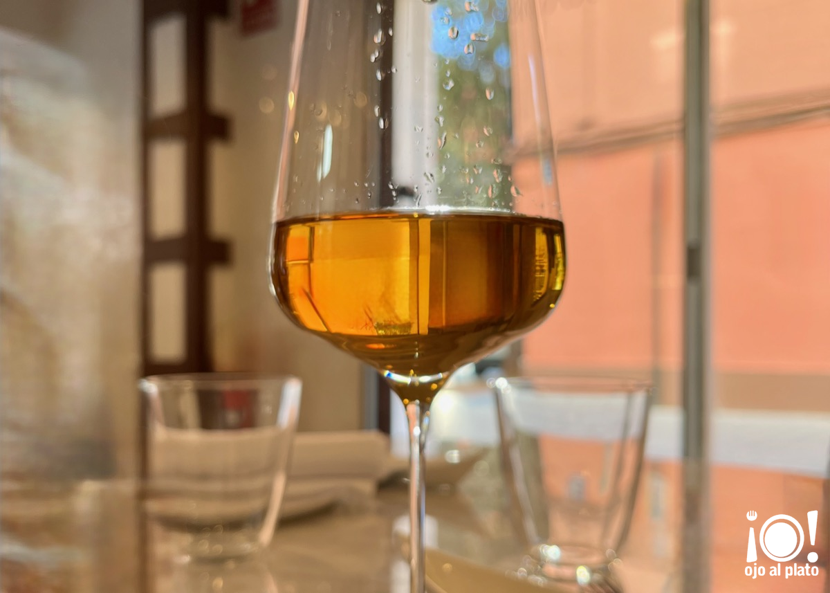 Con el aperitivo me gusta pedir algún generoso, especialmente amontillado, si estoy en un restaurante donde sé que se cuidan los detalles de las botellas, por eso le pedí a Álex esa opción. Un vino con una fase biológica (velo de flor) de unos 5 años y fase oxidativa de unos 10 años. Aromas de avellana y piel de naranja. Delicioso.