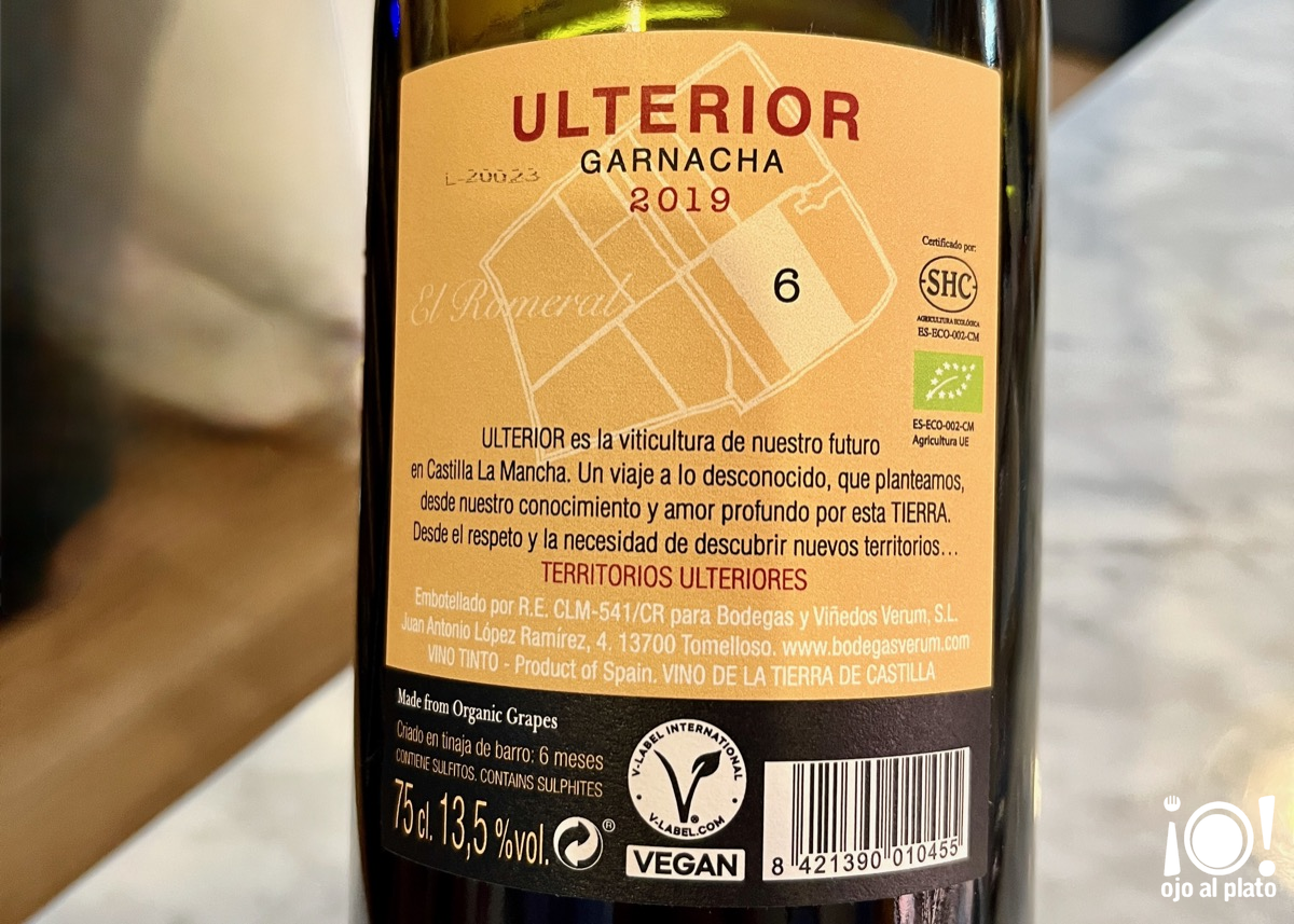 El otro vino que disfrutamos fue este Ulterior 2019 de Bodegas y Viñedos Verum, ubicada en Castilla-La Mancha. Tiene el color de un vino clarete, aunque no lo es, tiene un color rojo de capa baja y ribete rojo, es monovarietal de Garnacha que ha permanecido durante 11 meses en tinajas de barro. Presenta aromas florales que se acompañan de fruta roja con un sutil toque terroso que le aporta complejidad. En boca sorprende la sensación sedosa y la frescura típica de la variedad. Un placer beberlo.